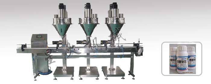 【產(chǎn)品名稱】:瓶裝粉劑農(nóng)藥灌裝機(jī)-DCS-2B-103三頭喂罐半自動(dòng)粉劑灌裝機(jī)